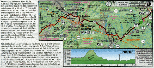 0(0 km)Continue on Rowe Rd (A) 0.3(0.5)At stop sign, turn right then bear left onto Welty Church Rd. (B) 2.1(3)Bear left onto Frazier Rd. In 0.1 mi, at "Y" bear right onto Rinehart Rd. (C) 3.1(5)At "T" turn right onto unsigned SR 418. 3.4(6)Enter Penn- sylvania. Route becomes Midvale Rd. In 0.1 mi, turn right onto Harbaugh Church Rd. (E) 5(8)Continue straight onto Waterloo Rd. (F) 5.4(9)Turn right onto unsigned Old Rte. 16. (G) 7.7(12)Turn right onto Buchanan Trl./SR 16. 8.6(14)Blue Ridge Summit. (H) 15.6(25) Turn left onto Orchard Rd. (I) 16.6(27)Turn left onto Tract Rd., then immediately right onto Boyle Rd. (K) 18.9(30)Turn left onto unsigned Emmitsburg Rd./US 15 Bus./ BicyclePA Route J. 25(40)Millerstown Rd. Matchline.