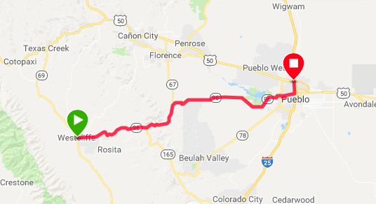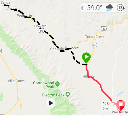 They didn't have the bolts but Greg did buy a new headlight since his old one had a defective mount. When the fellow who was helping us heard we were planning to ride through the Arkansas River canyon on highway 50, he strongly suggested we take a cab instead. That route has high-speed traffic on a two-lane road with no shoulders in many places and lots of blind curves. He said last year two cyclists who had been warned about the danger and rode anyway were killed.
