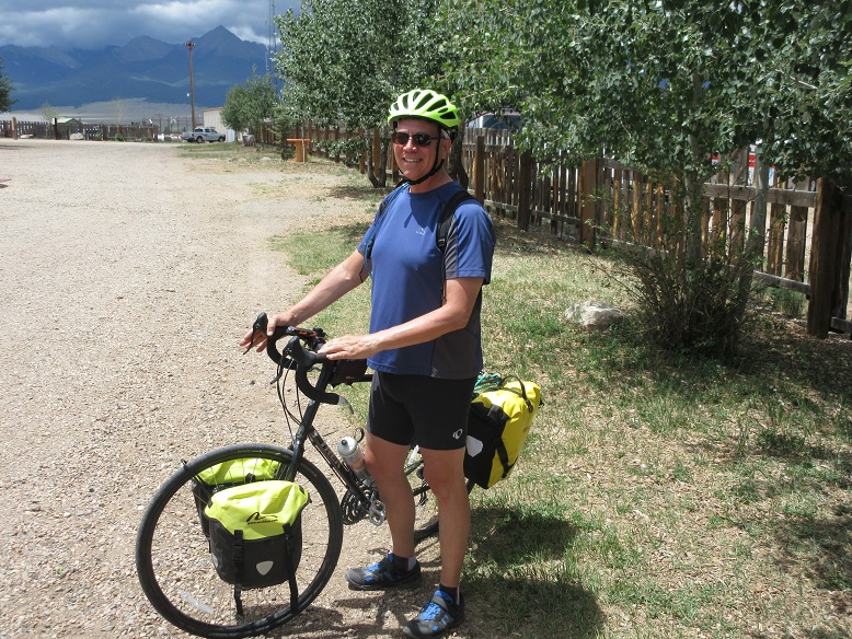 Greg bought a new Trek 520 for this trip and mounted racks and panniers on it for the first time. He had serious shimmy problems at certain speeds due to the front rack not being mounted correctly. We worked on it in front of the hotel room, but I didn't have the correct length bolts in my spare parts bag to make the repair, so we rode into old town Salida to the Absolute Bikes bike shop.