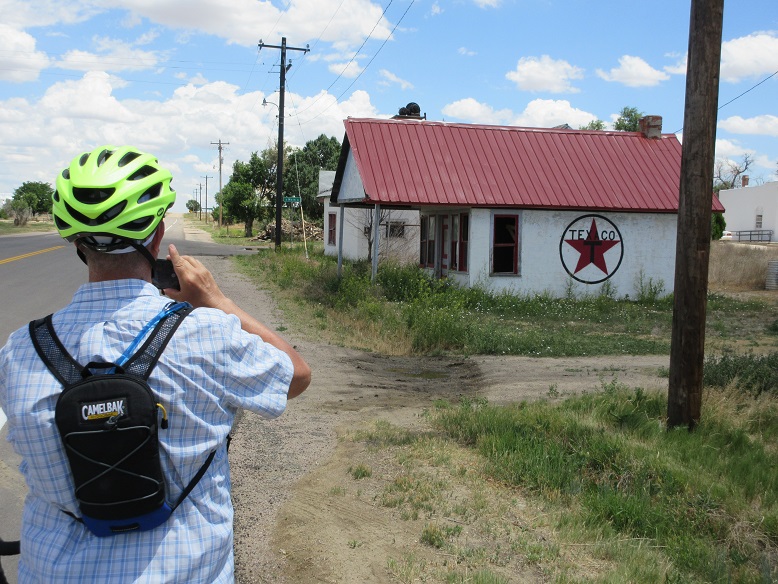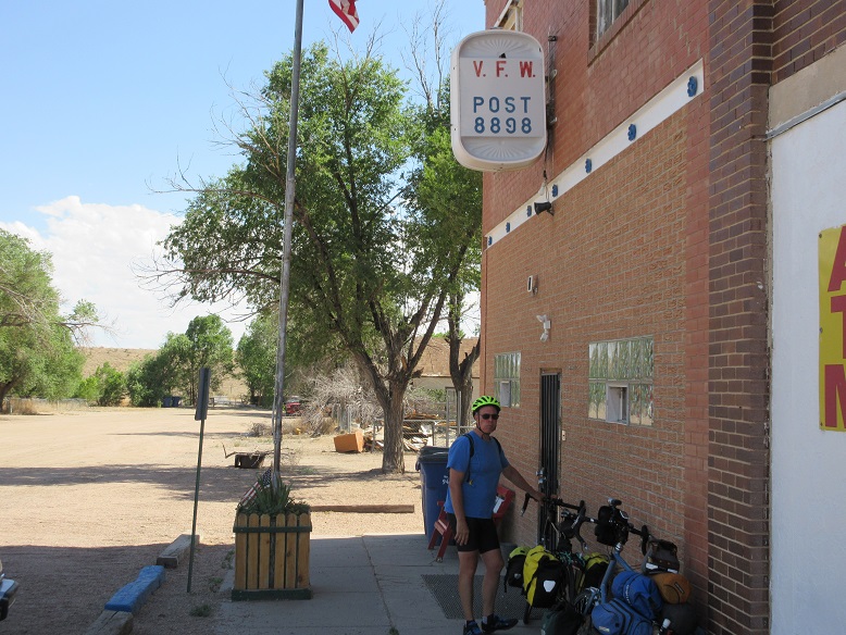 We stopped again in Olney Springs and found a water spigot in from of the police station, which was fortuitous because Greg was almost out of water. Val called and told us to stop at the bar in Crowley, about 5 miles from Ordway. We stopped and each bought two sodas.