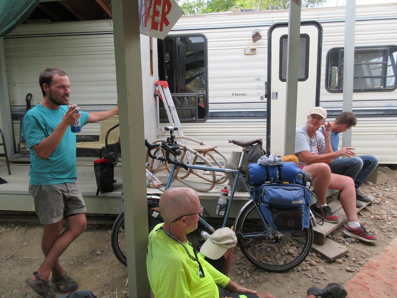 I am now once again riding with panniers and camping gear on the bike. The ride started with a long 1300-foot climb, followed by a long, steep downhill gradually rolling out to our destination.