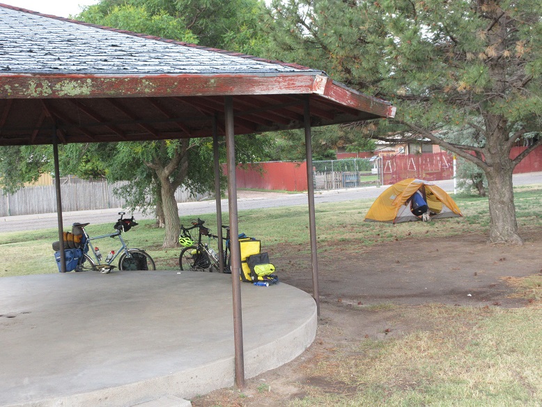 We're camped by the gazebo in the town park in Tribune. It is actually quite nice. We can watch the softball game going on across the road, on the other side of the tennis courts. A bicycle tourist, a Lutheran theologian from Germany, was also staying there and just slept on top of the picnic table.