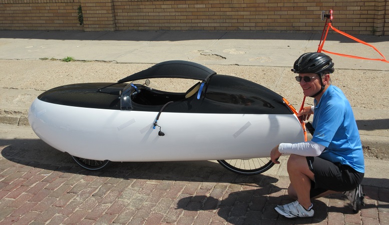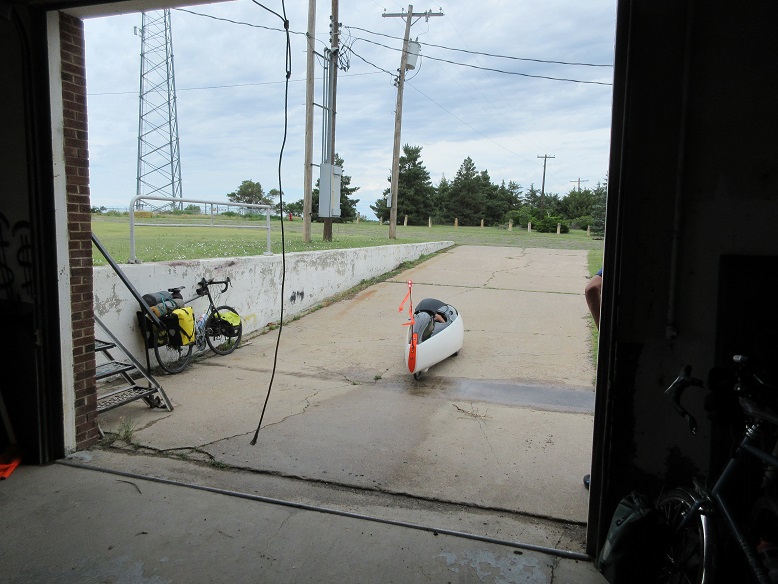 Just after, in rolled a guy on a fully-faired recumbent, called a "velo mobile". His name is Allan (with two Ls) and he said he had been hearing about us for days.
