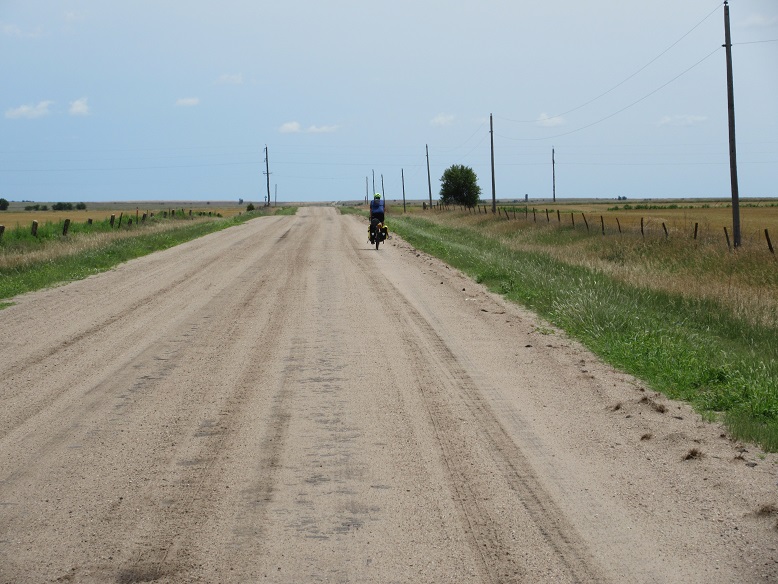 We passed into Kansas about 16 miles before our destination of Tribune. The biting flies were attacking our ankles so we got back on the road as soon as possible after snapping the photo.