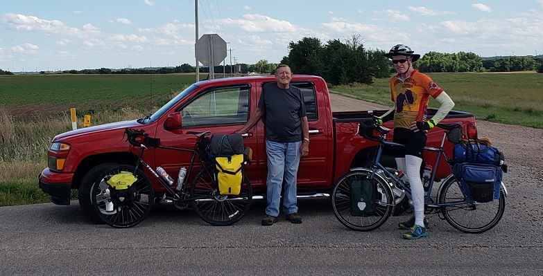 We're in a motel in Larned tonight because it is supposed to rain tonight and the alternative is camping in the city park with iffy access to toilets. When I was outside talking on my cell phone Allan happened by and later came over to the room to chat and to give us contact information for David (the father at the high school).