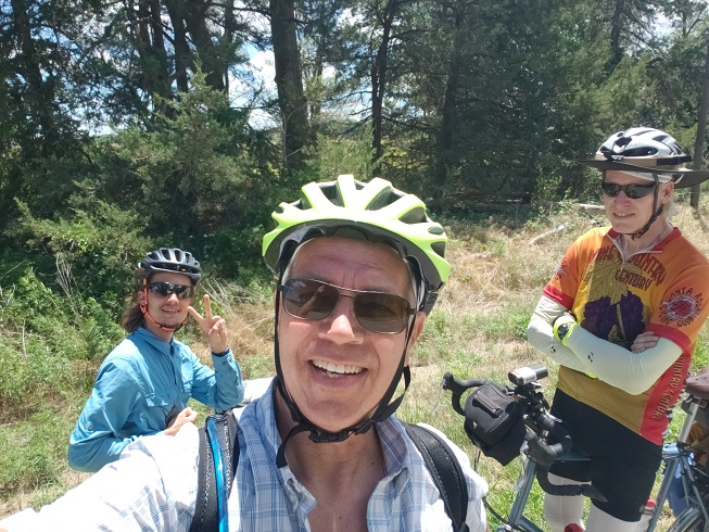 Several minutes later in rolled two other touring cyclists, Rosie and Kevin. They had met by chance back in Virginia and have been riding together ever since. Rosie had got tired of people complaining about her old-fashioned non-smart cell phone, so she bungied an old dial phone on the back of her rack and tells people that's her "old phone".