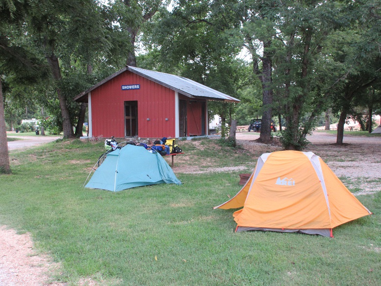 We're camped at the Arrowhead Campground, in a patch of grass behind the showers/toilets.