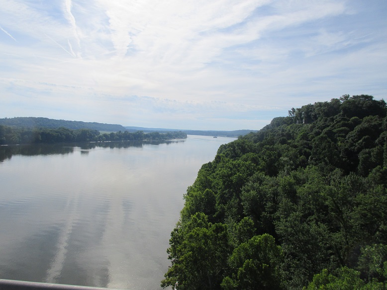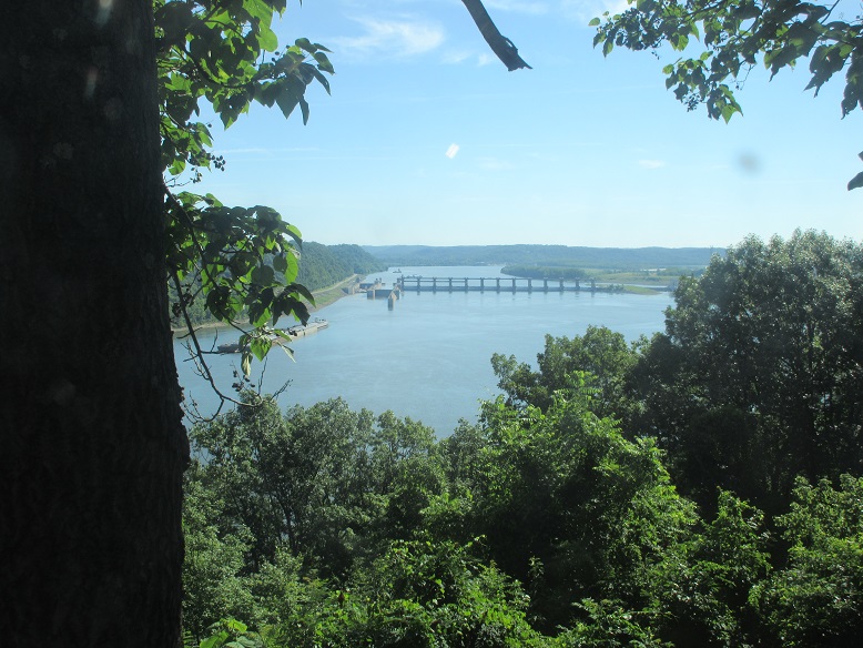 We took the "Big Four" pedestrian bridge over the Ohio River to get from Indiana back to Louisville in Kentucky. Here's a photo of the river from Riverside Drive, before the bridge, looking back at the auto bridges.