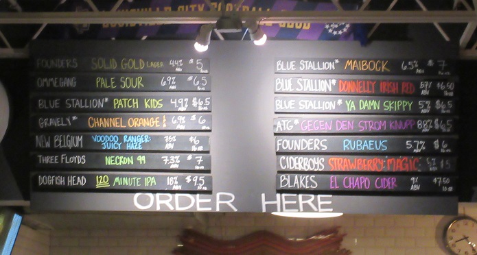 For dinner we walked about an hour to a restaurant Greg had spotted in his journey, the Grind Burger Kitchen. It started to rain just before we got there. They are supposed to have some of the best burgers in town. The burgers didn't quite live up to their reputation, but Greg was overjoyed to see they had his favorite beer of all time, Dogfish Head 120 minute IPA, on tap.