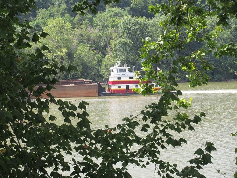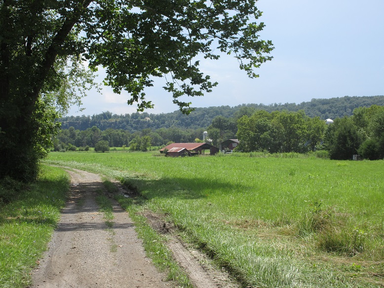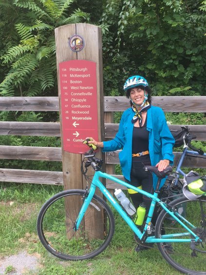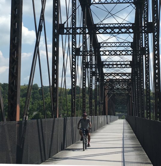 From Pittsburgh we were travelling on the Great Allegheny Passage (GAP) trail, an unpaved but well-packed rails-to-trails conversion that follows the Monongahela River to Mckeesport and the Youghiogheny after that. In McKeesport, everyone was missing this turn on the trail, including me, until Val found the sign and pointed it out.