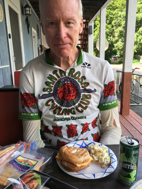 Frostburg is one of several formerly-decaying towns on the bike trail that now cater to cyclists. However there was nothing open on a Sunday so for lunch we had sandwiches of bagels and some porkchops, Muenster cheese, and mustard plus some potato salad and Perrier water that Val had in her ice chest. We weren't suffering too much.