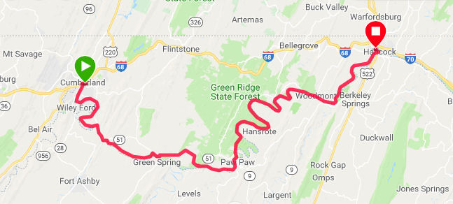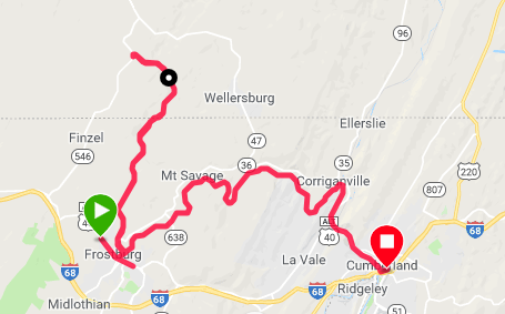 Val's string of bad luck continued. The plan today was for her to do the normal trick of driving to the destination, cycling back on the route to meet me, and then riding together to the end. She just entered Frostburg into her iPhone and expected Google maps to lead her to the correct place.