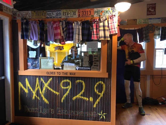 I had no desire to ride any more of the C&O than necessary so we rode together to the end of the rail trail and then rode back to Hancock where we had lunch at the fabulous Buddylou's for lunch. Buddylou's is a combination ice cream parlour, foodie restaurant decorated in 60's decor, antique store, and the studio of an oldies radio station tucked in a corner of the dining room. (Notice the cut-off flannel shirt sleeves used as a curtain.)