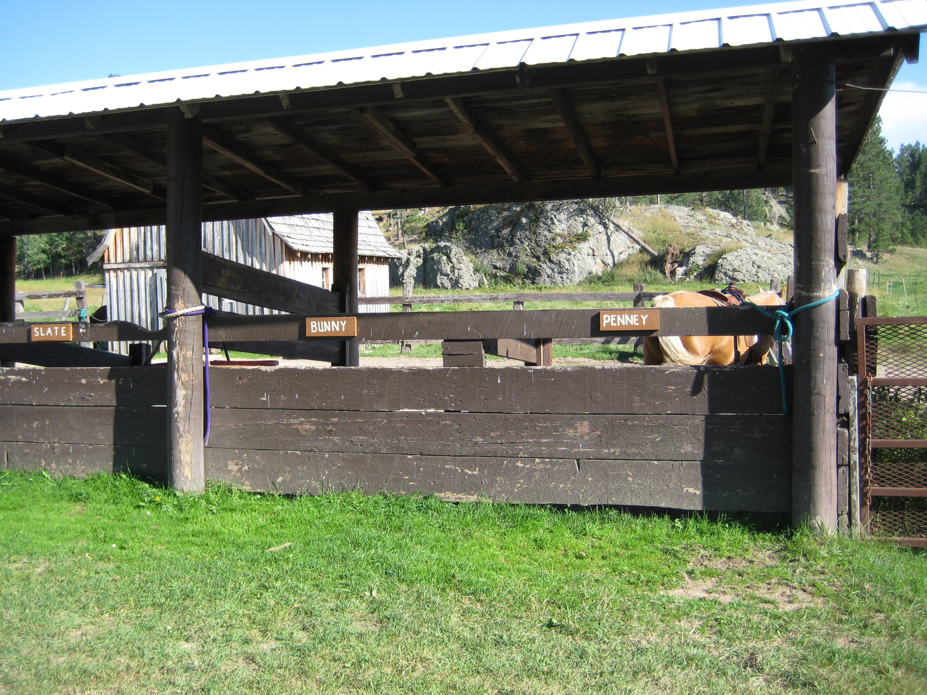 The barn is just behind the horse stalls and a horse-drawn wagon is in the foreground.