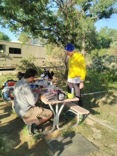 While we were eating a couple came up on mountain bikes. They are in one of the RVs. The man said that he had long wished to do what were were doing but never could get away from work and family committments. Now they are traveling by RV instead. Later, after their ride, he came over to check out my "da Brim" helmet brim.