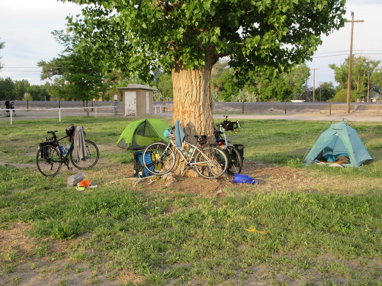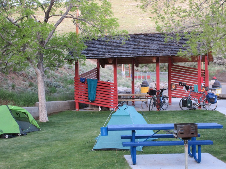 We're camped at the city park on the north (higher) end of town. It is actually very nice. Cyclists can camp for free on a nice grassy lawn and use the toilets. We were the only people there the whole evening. Unfortunately the swimming pool was still closed for the season or perhaps we could have used the showers. There are electrical outlets in a little pavillion right next to where we pitched our tents so we could recharge our electronic devices.