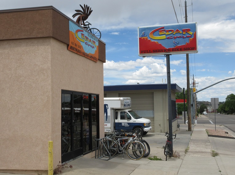 I'll be parting ways with Kate and Jim tomorrow as they pursue a route via Zion and Grand Canyou national parks. But I will be picking up a new ridiing companion that I met electronically via the Adventure Cycling "Companions Wanted" list. Val lives near St. George, about an hour's drive from here. She is fairly new to bicycle touring, so her plan is to bring her car. Each day she will drive to the destination and cycle backwards on the route until we meet and then ride back again together. She had a last-minute work committment pop up yesterday but is trying to get that done in time to meet us for dinner tonight. We're planning to go to Sizzler so we can partake of their all-you-an-eat salad bar (which includes non-salad items as well). "All you can eat" is music to the ears of a touring cyclist. :=)
