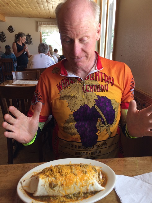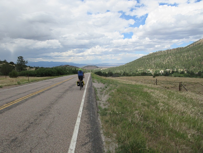 I am now once again riding with panniers and camping gear on the bike. The ride started with a long 1300-foot climb, followed by a long, steep downhill gradually rolling out to our destination.