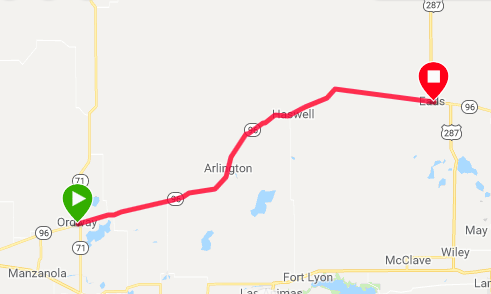 Val did 42 miles today, the first 21 with a tailwind and the last 21 miles with a headwind. She talked to Joe, another touring cyclist who was in the bar, who told her about Gillian, a Warm Showers host in Ordway. The alternative was to camp in the city park, but they lock the bathrooms between 8 pm and 8 am