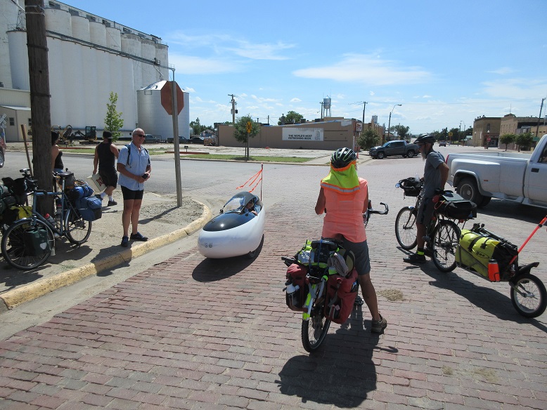 Just after, in rolled a guy on a fully-faired recumbent, called a "velo mobile". His name is Allan (with two Ls) and he said he had been hearing about us for days.
