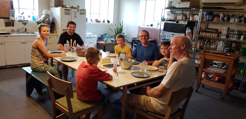 Sure enough, the old high school building is now the home of a family consisting of David and Krista, their 6 adopted kids and two other kids visiting from Ukraine. We all had dinner together and then Greg performed some of his repertoire of magic tricks for the assembled audience. (Thanks Greg for this photo.)
