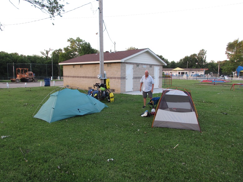 It was very hot today. We were pretty wasted by the time we got into town. The police had half the town blocked off because of the tornado damage and most of the businesses in town were closed because of lack of power. The only hotel in town was closed for that reason. The supermarket was open so we were able to get some food and head for the park to camp.