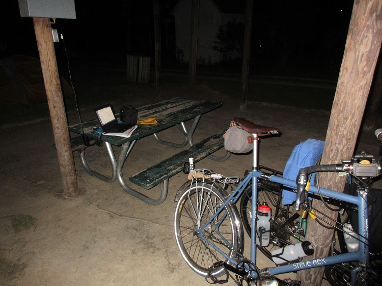 There is power on a post at the pavillion next to our tents so I was able to plug in the laptop, update the blog, and charge the Garmin from the laptop.
