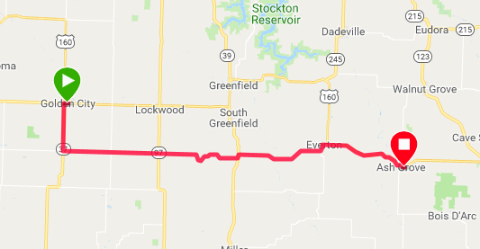 After lunch at the Napolis Italian restaurant in town we set off in the heat of the day on the 32-mile journey to the town of Golden City MO.