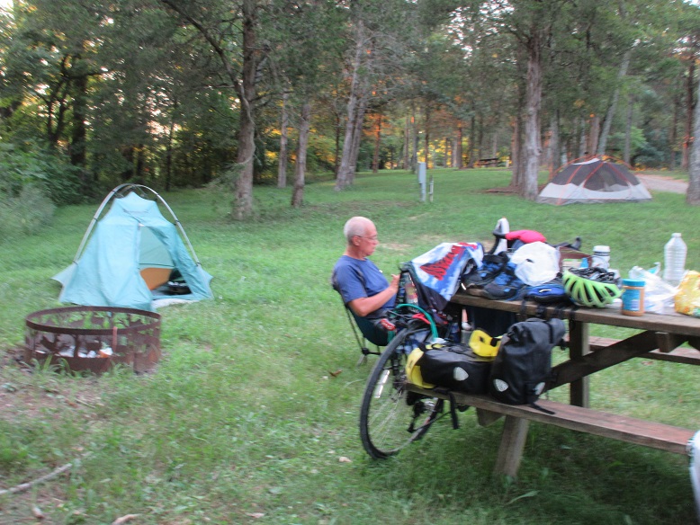 We are camped at Cedar Lake Ranch campground, just east of the wide-spot-in-the-road known as Tunnel Hill. It is most popular with equestrians but they are not here now because it is too hot to ride. We have the place mostly to ourselves. We have a nice shady camp site about 0.3 miles from the showers and toilets.