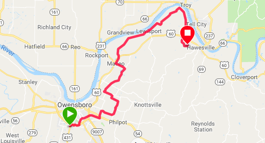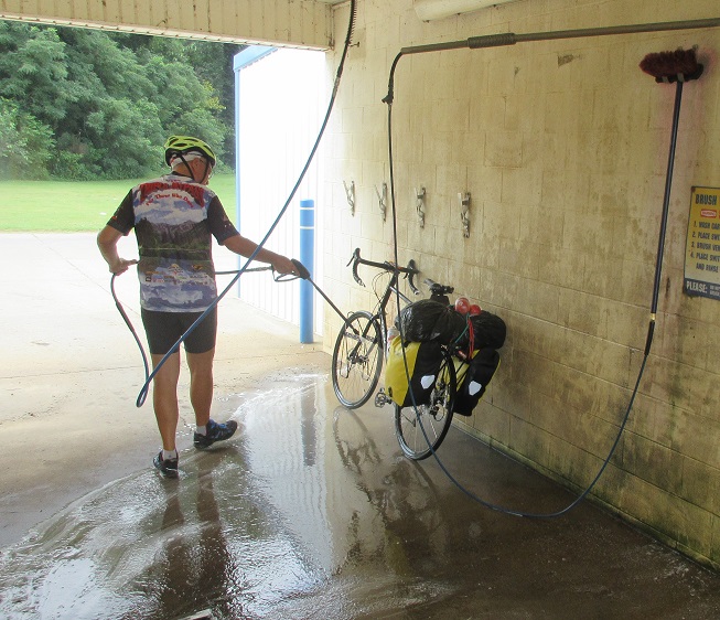 Later we stopped at a car wash. The bikes cleaned up nicely, but we shouldn't have done that. Just as washing your car makes it rain, so it goes with bikes. We got dumped on as we were wending our way through Owensboro. If we had been a half hour earlier, we would have stayed dry.