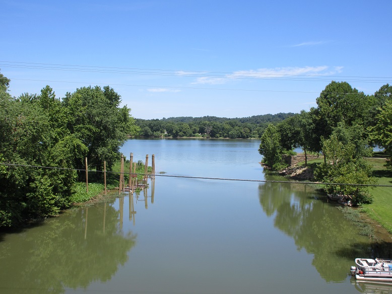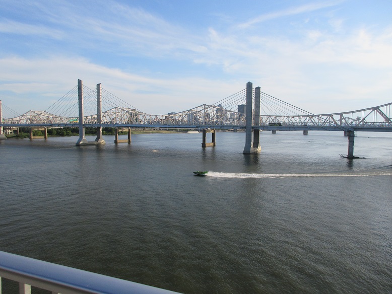 We took the "Big Four" pedestrian bridge over the Ohio River to get from Indiana back to Louisville in Kentucky. Here's a photo of the river from Riverside Drive, before the bridge, looking back at the auto bridges.
