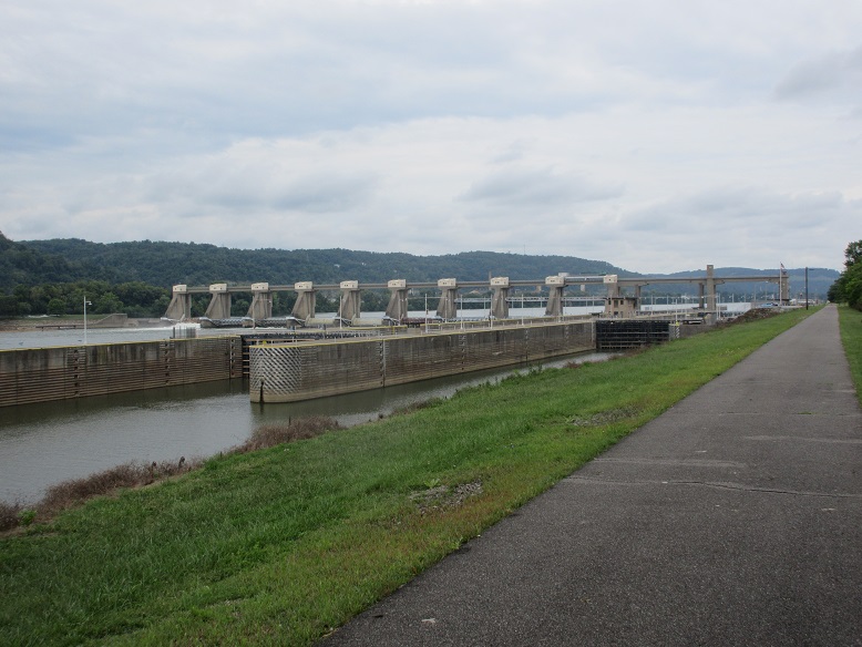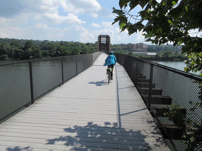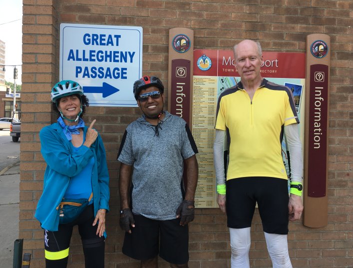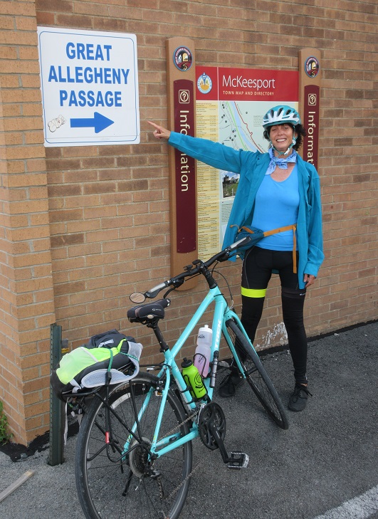 From Pittsburgh we were travelling on the Great Allegheny Passage (GAP) trail, an unpaved but well-packed rails-to-trails conversion that follows the Monongahela River to Mckeesport and the Youghiogheny after that. In McKeesport, everyone was missing this turn on the trail, including me, until Val found the sign and pointed it out.