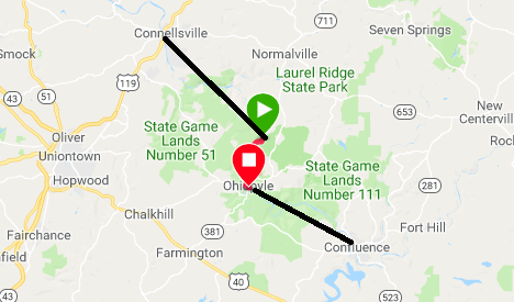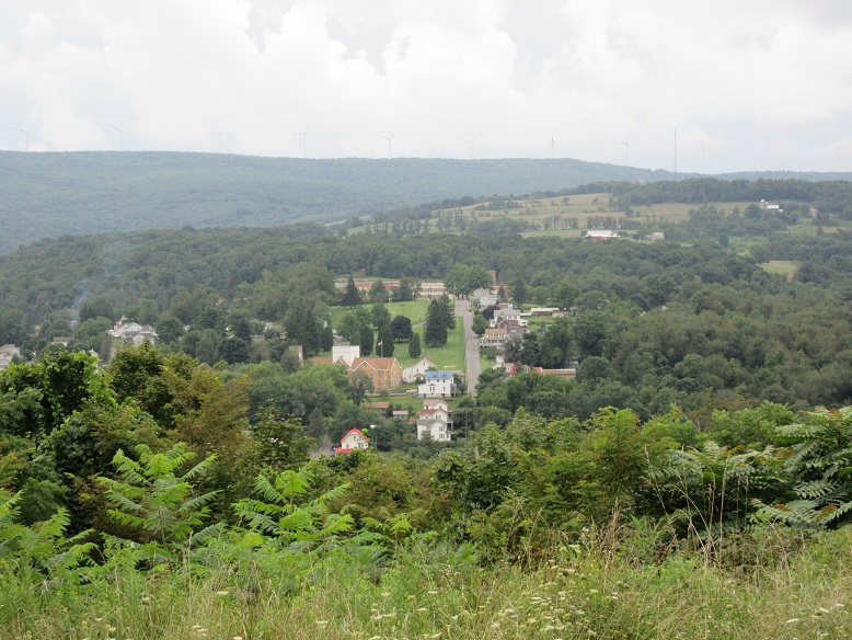 We met for a nice lunch in Ohiopyle but by the time we finished there was a heavy thunderstorm, so we just drove the 11 miles to Confluence. (This photo is looking out the car windshield.)