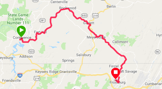 Unfortunately I had neglected to tell her that we were going to Frostburg MD, not Frostburg PA! I had forgotten that we go from Pittsburgh PA to Gettysburg PA via Maryland. She described a hilarious scene in a tobacco store in Frostburg PA where none of the patrons could make head nor tail of her Adventure Cycling map of Frostburg MD. By the time she got to the correct Frostburg it was too late for her to ride.